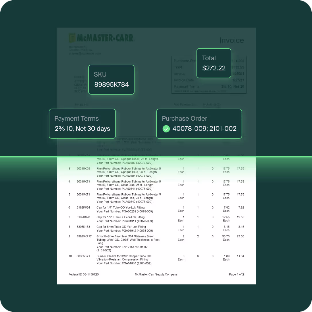 Efficiently extract Purchase Order (PO) numbers and payment terms from documents, streamlining the accounts payable process and enhance transaction accuracy.